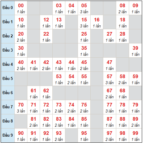 | Bộ số | Số lần về | Bộ số | Số lần về |